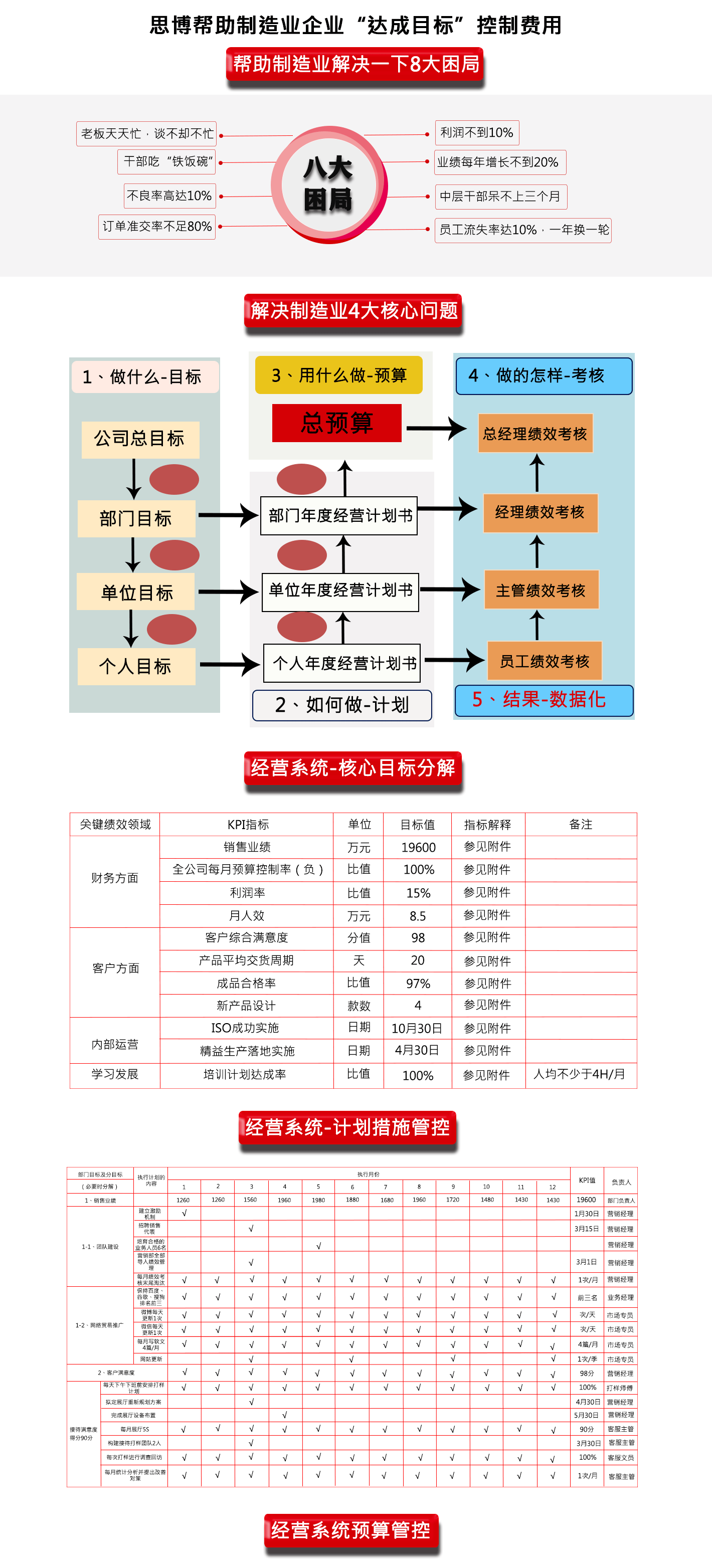 深圳市思博企業(yè)管理咨詢有限公司(sinbo) 是擁有多年管理實踐的實戰(zhàn)型管理咨詢企業(yè),思博數(shù)十人的咨詢師團隊用近十年的時間潛心研究世界管理大師彼特·德魯克的目標管理及臺灣陳宗賢教授的企業(yè)經(jīng)營計劃管理,同時深入日本、臺灣、歐美等知名企業(yè)學習先進管理理念及技能,結合中國企業(yè)本土化的特點,成功研究出一套適合中國國情的企業(yè)經(jīng)營管理系統(tǒng)《企業(yè)年度經(jīng)營計劃與全面預算管理》。該系統(tǒng)在思博團隊的潛心指導下,已成功幫助中國數(shù)百家企業(yè)實現(xiàn)年業(yè)績增長40%